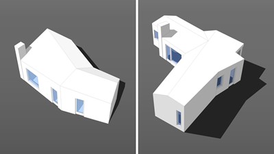 Två små men supereffektiva fritidshus i den svenska skärgården. Varje vinkel eller hörn har en funktion; antingen ger den lä, skugga eller kanske stöd mot ryggen. Den geografiska placering har självklart en avgörande betydelse för varför byggnaderna ser ut precis som de gör. Nu avslöjar dessa två bilder inte direkt så mycket om själva platsen men varje fönster ramar in en specifik utsikt och fyller rummen med dagsljus exakt där det behövs.